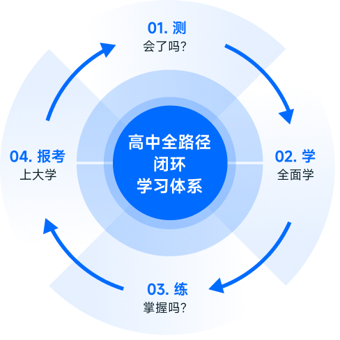 全路径闭环学习体系,融合测、学、练、报考四大核心环节,通过多形态,N场景的体系构建和场景模拟,提供高效能的高中学习、升学解决方案。通过精准测评定位知识盲点,定制性学习路径专项提升,针对性训练巩固理论基础,并搭配实战练习强化技能,最终无缝对接报考流程,确保高中全阶段,每一步都扎实有力。